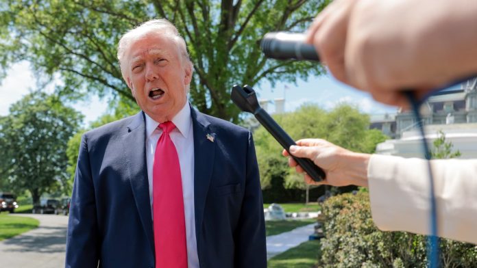 تحدث الرئيس دونالد ترامب إلى وسائل الإعلام قبل صعوده على متن طائرة Marine One في حديقة البيت الأبيض الجنوبية في 16 أبريل 2026.