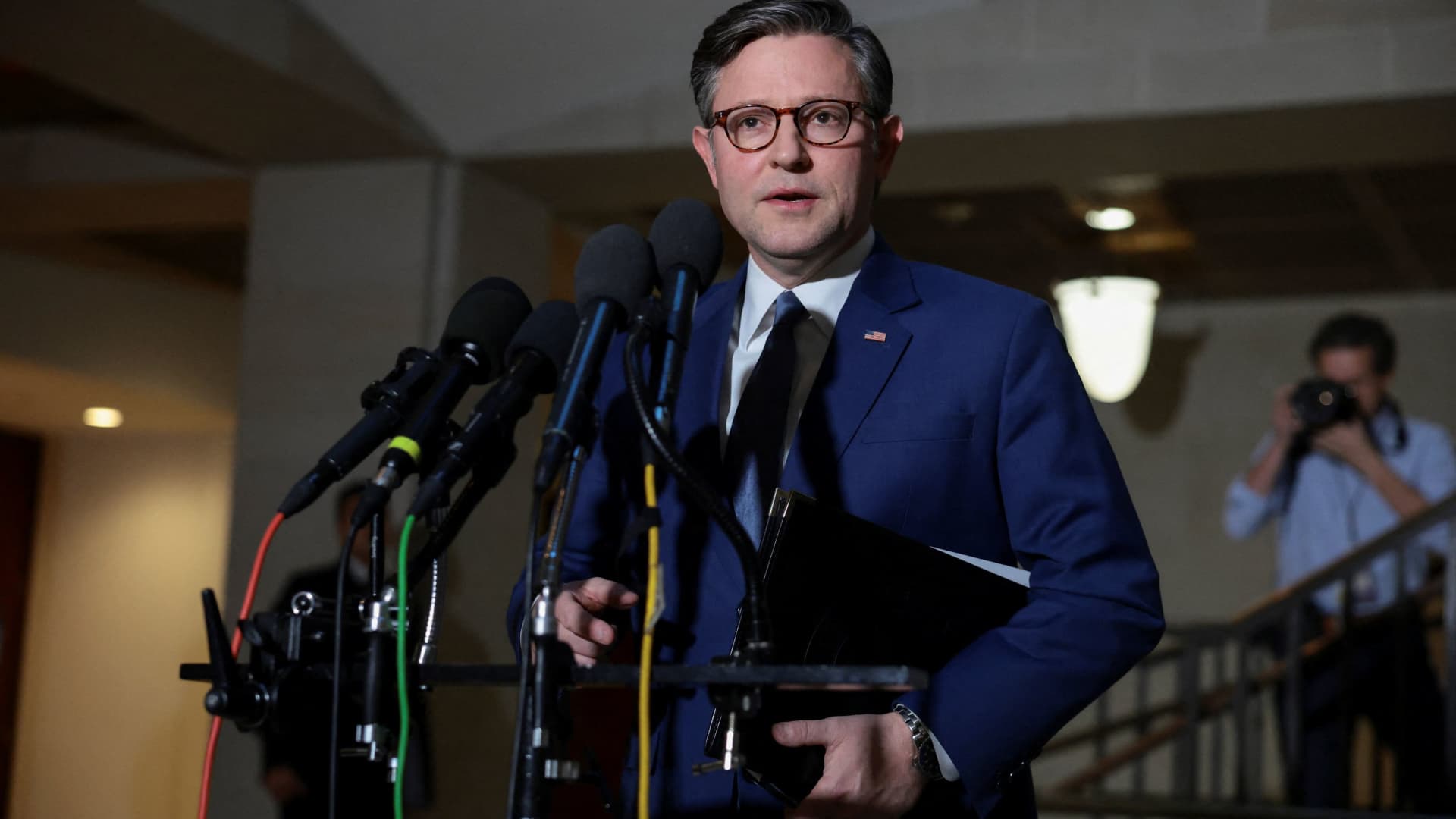 تحدث رئيس مجلس النواب، مايك جونسون، إلى وسائل الإعلام قبل إحاطة أمنية حول الإجراءات الأمريكية في فنزويلا، في الكابيتول هيل في واشنطن، D.C.، في 5 يناير 2026.