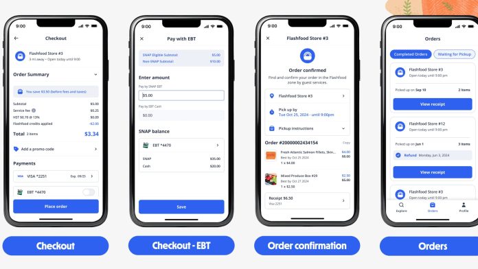 تربط Flashfood المتسوقين بالمتاجر المحلية لشراء الطعام القابل للتلف بأسعار مخفضة. يمكن للمستخدمين تصفح وشراء ودفع ثمن العناصر مباشرة عبر التطبيق، ثم استلام الطلبات من ثلاجة مخصصة في المتجر.