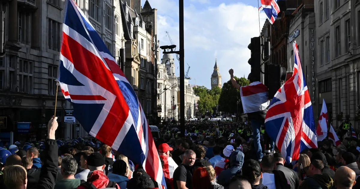 خرج أكثر من 100 ألف محتج في مسيرة بوسط لندن يوم السبت، حامليًا الأعلام الوطنية في واحدة من كبرى مظاهرات اليمين في التاريخ الحديث للمملكة المتحدة، والتي نظّمها الناشط المناهض للهجرة تومي روبنسون.